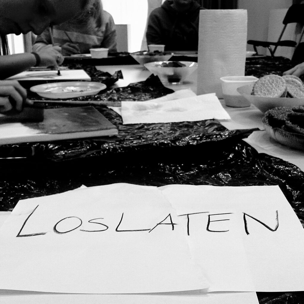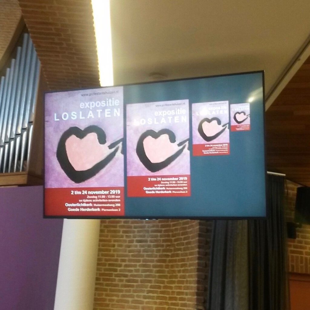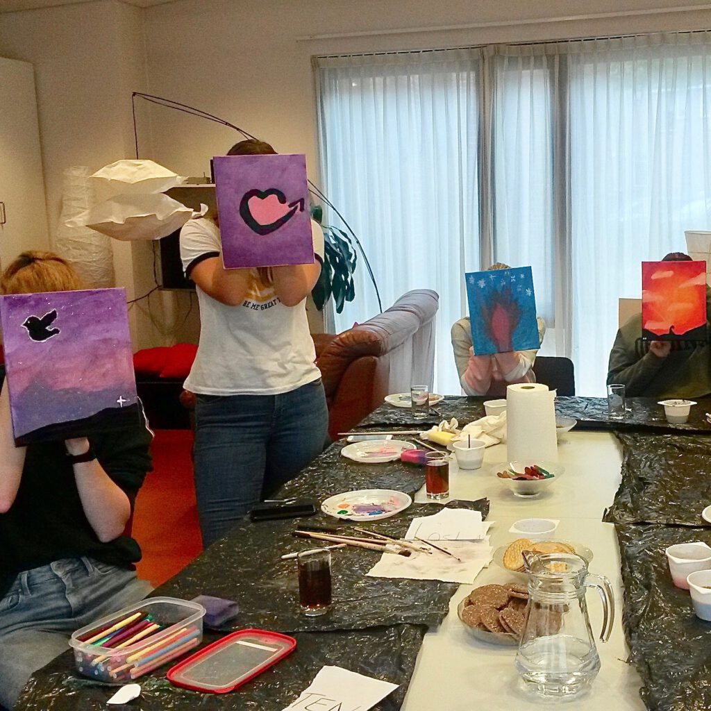 Verschillende keren verzorgde ik een workshop voor de tienergroep in de Oosterlichtkerk in Huizen. Ze werden aangemoedigd om met hun schilderijen deel te nemen aan de jaarlijkse expositie in de kerk. Op de foto de workshop bij de expositie Loslaten. Het kunstwerk van een van hen dat je rechts ziet, werd door de expositiecommissie uitgekozen voor het affiche van de expositie.