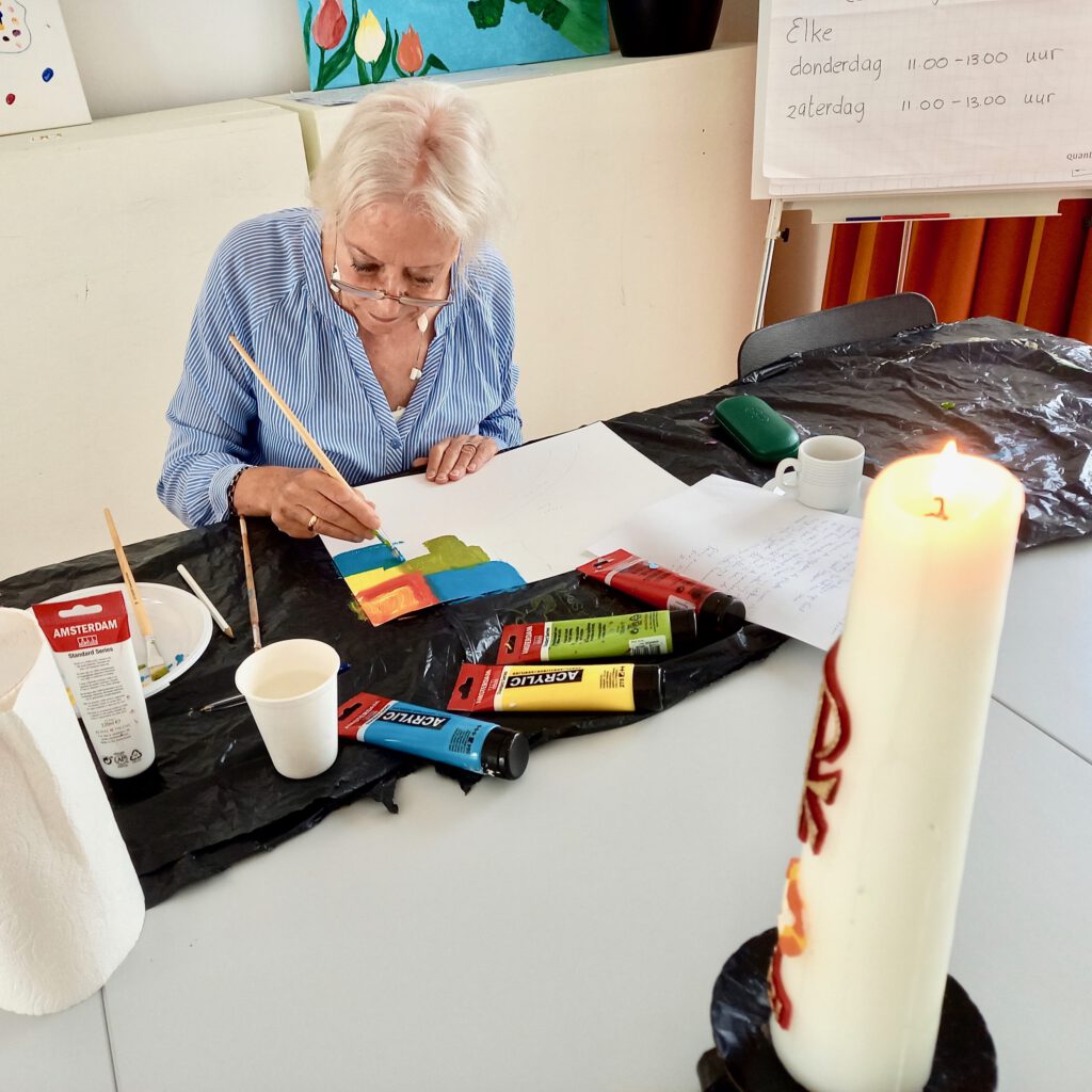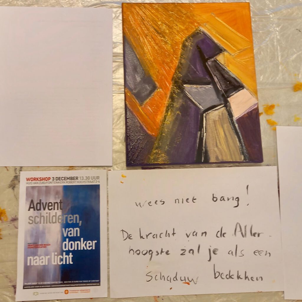 Verschillende jaren verzorgde ik in de Oosterlichtkerk/De Duif in Huizen, 4-weekse schilderworkshops rond Advent. Alle resultaten werden per week in de kerk gehangen.