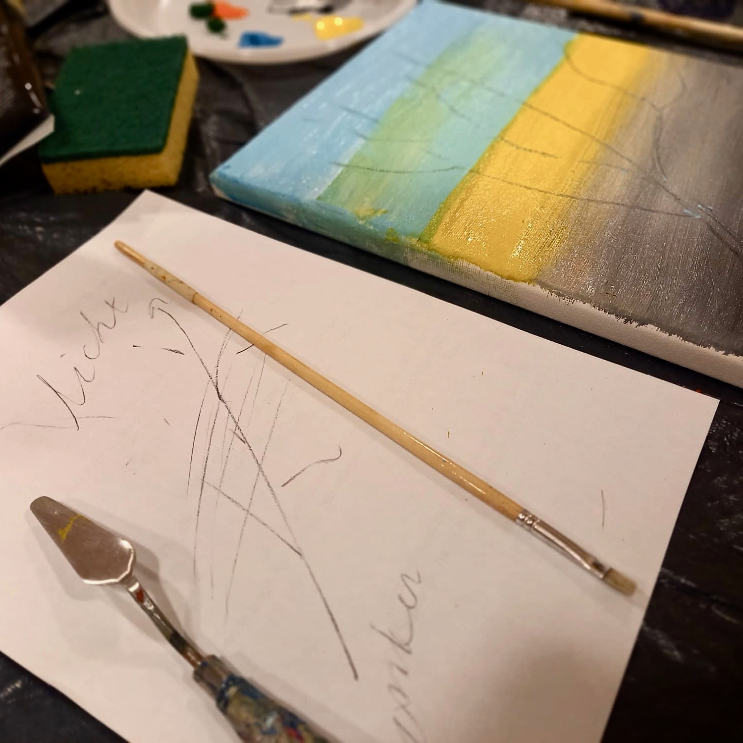 Voor gevorderde kunstenaars (maar iedereen is welkom die open staat voor het experiment) ontwikkelde ik de workshop Beeldend Bezinnen met Muziek. Hierbij wordt er geschilderd bij een Bijbeltekst, een bijpassend gedicht en bijpassende, klassieke muziek. Eenieder haalt er een persoonlijk thema uit. Meer over deze workshop op de workshoppagina >>