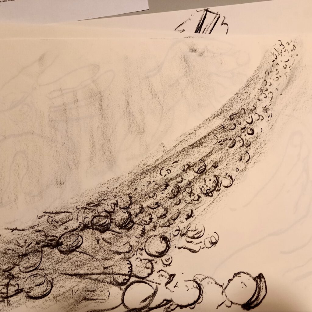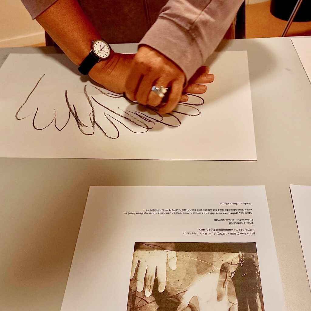 Materialen: we bekijken de kunst via een beamer en prints. We tekenen met houtskool op A3 schetspapier.