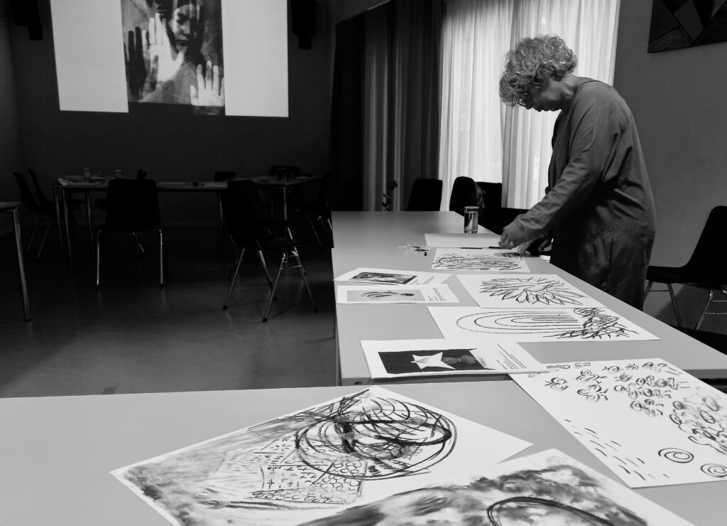 Na elk deel ga je met houtskoolschetsen – en tekeningen reageren op wat je hebt gezien en waar je op hebt gereflecteerd. Je gaat werken met beeldelementen, vrije associaties, gedachten en diepere lagen. Zo verdiept zich de kunst en wordt het persoonlijk. Het kan verder inspiratie zijn voor nieuwe projecten.