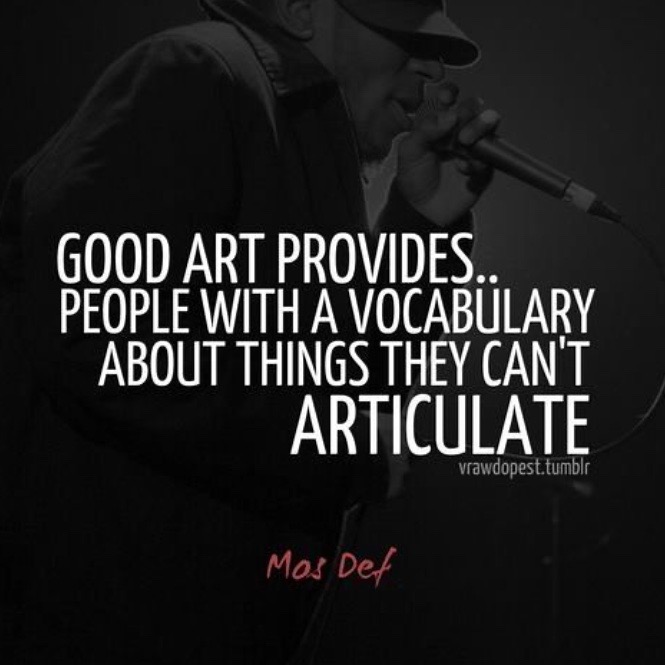 Het citaat rechts vertelt ons dat kunst ons een geheel eigen vocabulaire aanreikt van wat eigenlijk niet te verwoorden is. Wij verbinden woord en beeld.