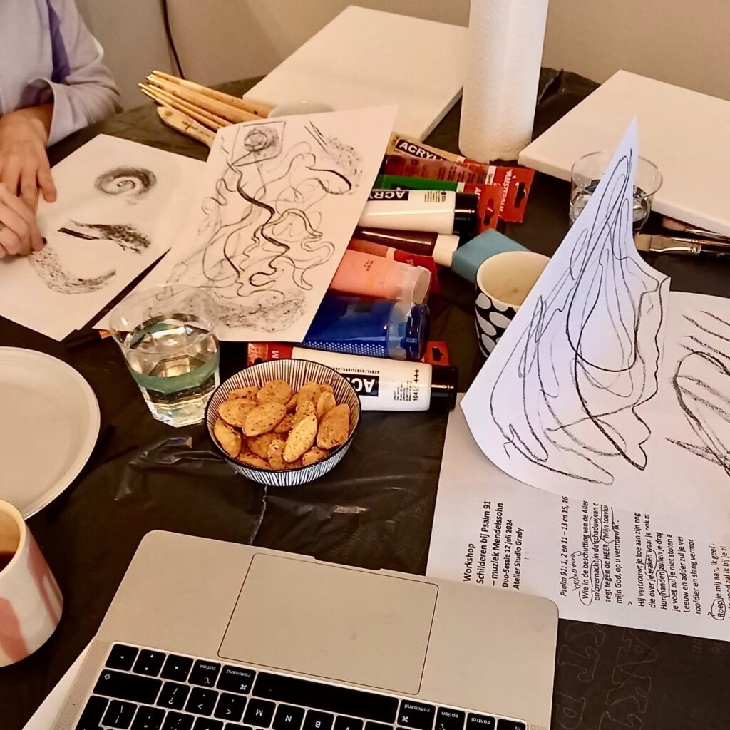 Een ander voorbeeld is een meer inhoudelijke workshop: schilderen bij een Bijbeltekst en muziek. Dit is een vereenvoudigde vorm van de workshop Beeldend Bezinnen met Muziek >>
