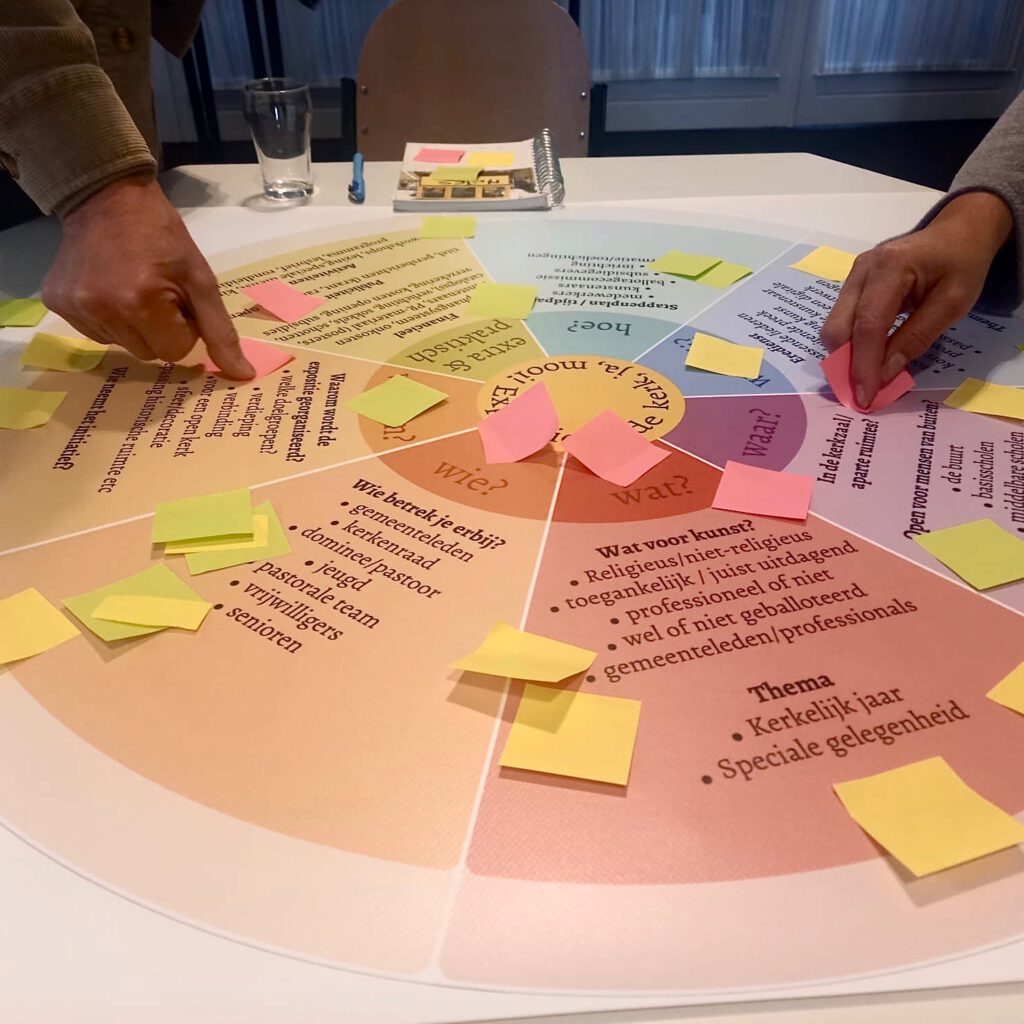 Voor kunstcommissies van kerken, over het hoe en waarom van kunst in de kerk, ontwierp ik het raamwerk vanuit een kunsteducatieve benadering. Zo gebruikte ik 2 methoden uit The Art of Hosting, voor democratische verkenning van een onderwerp: 1,2,4, all en World Café. Dit leverde een grote diepgang op rond verschillende vragen en stellingen en zorgde voor uitwisseling en contact.