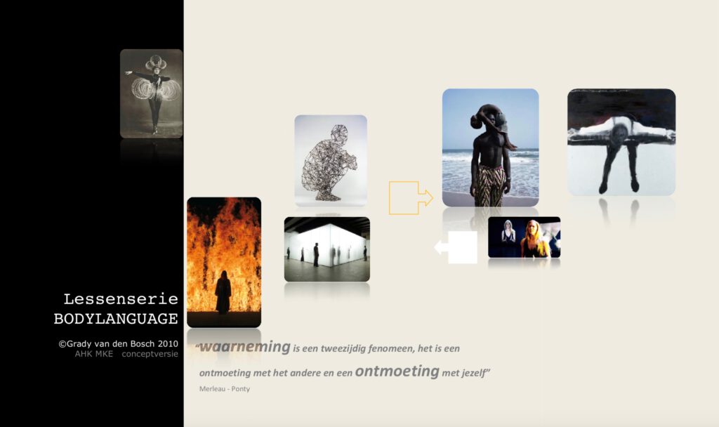 Een van de projecten die ik ontwikkelde in de master Kunsteducatie was een interdisciplinaire cursus kunstverdieping voor beeldend kunstenaars. Thema: Bodylanguage. Het ging om reflectief onderwijs.