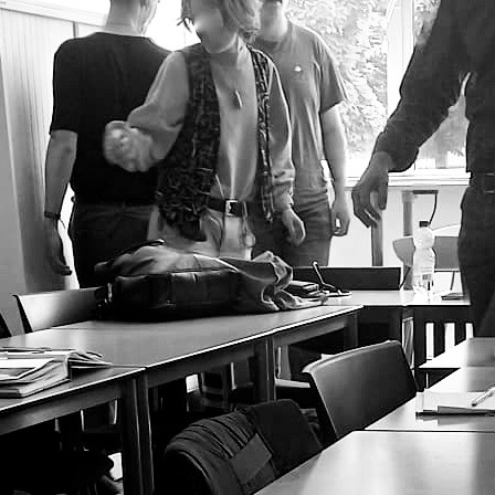 In eenvoudige theateroefeningen liet ik de studenten elkaar op verschillende manieren ontmoeten: laat zien hoe je je op je best voelt, hoe op je slechtst en hoe je je nu voelt. Het bleek een ontwapenende opdracht.